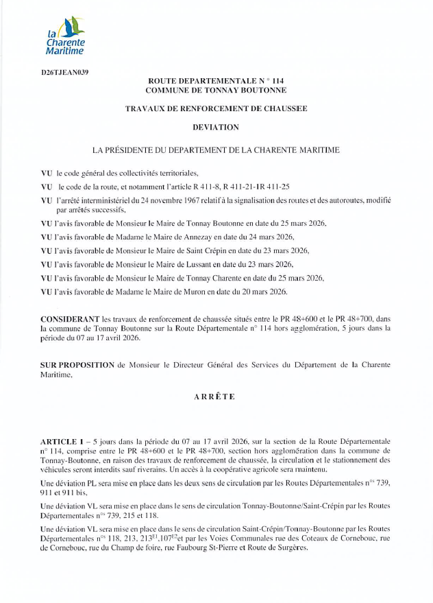 arrêté circulation d 114 – travaux tonnay-boutonnePar Delphine GOUGNARD / 26 mars 2026 Facebook Twitter LinkedIn Email Imprimer