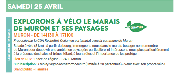 SEMAINE DE L’ARBRE ET DU PAYSAGE / RANDONEE VELO DECOUVRIR LE MARAIS DE MURON – SAMEDI 25 AVRIL 2026Par Delphine GOUGNARD / 21 avril 2026 Facebook Twitter LinkedIn Email Imprimer